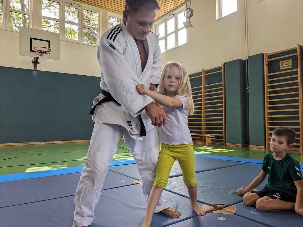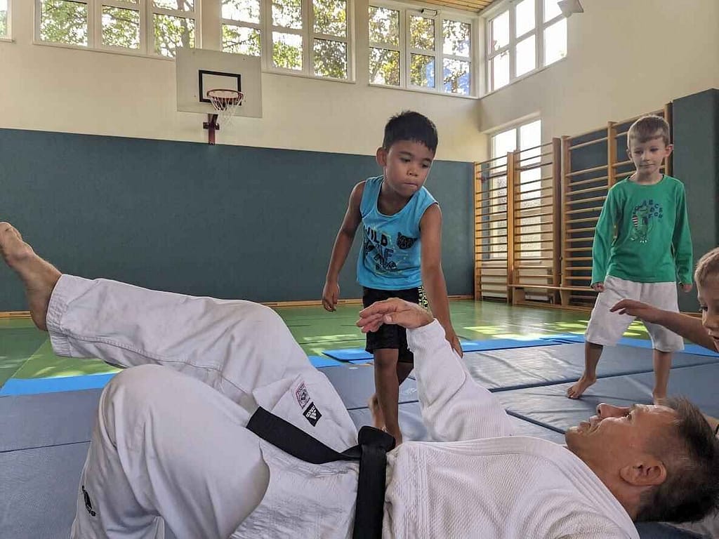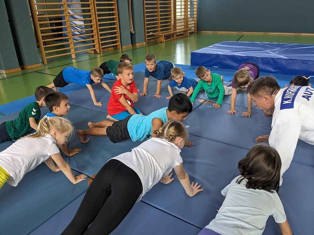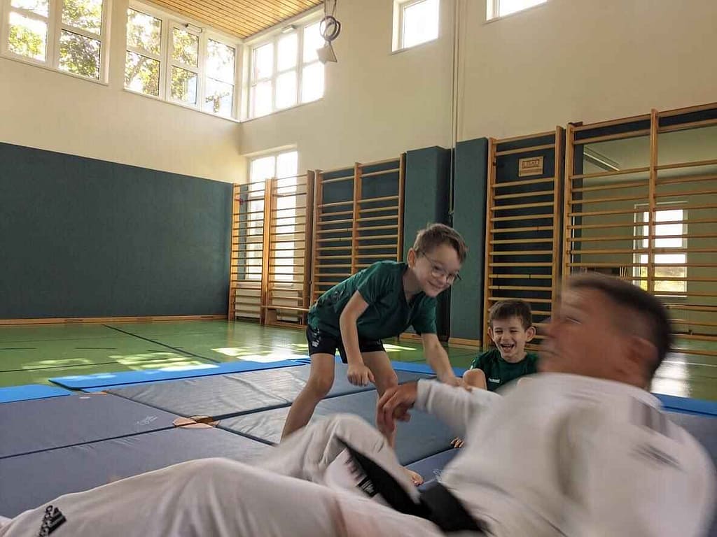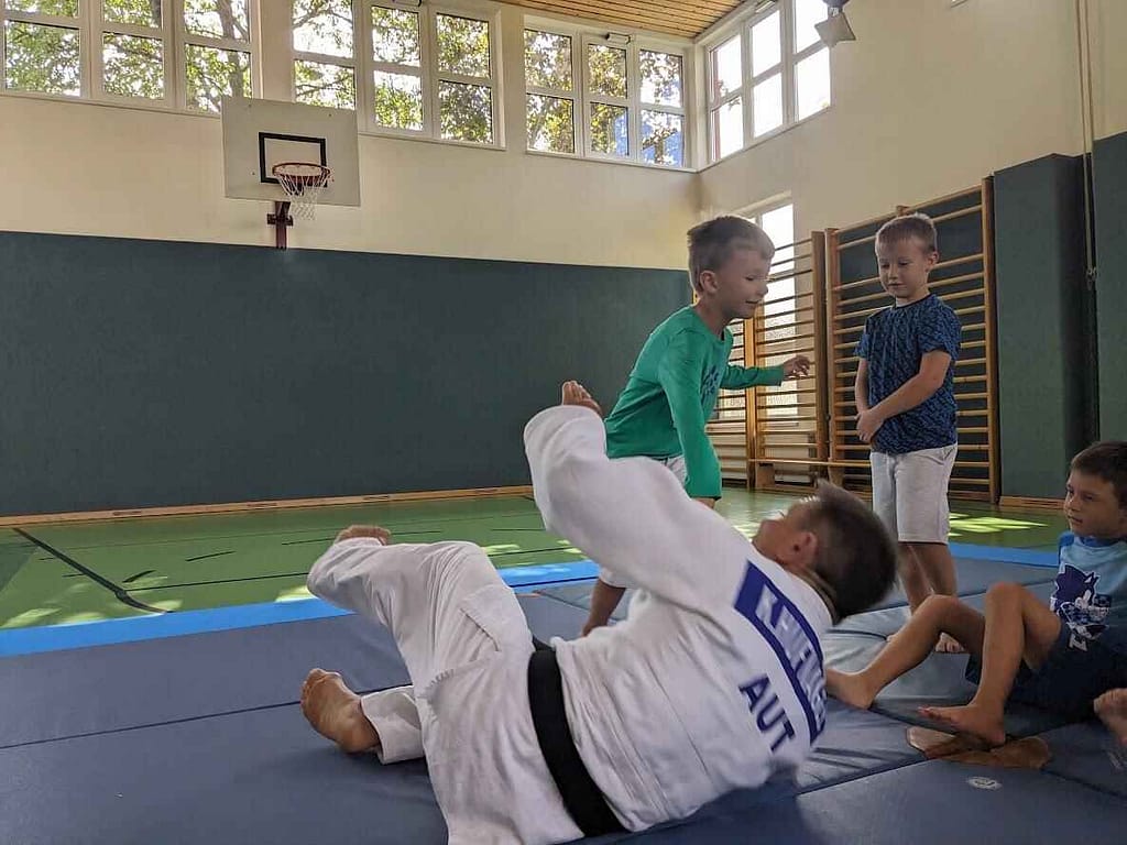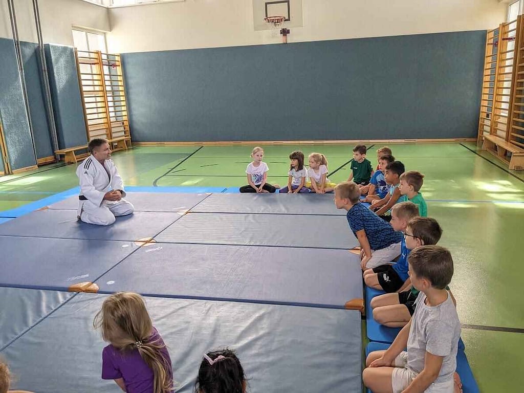 Die 1. Klasse durfte von einem echten Profi der Judohaie die Grundlagen des japanischen Kampfsportes Judo kennenlernen. Zuerst wurde die rituelle Begrüßung durchgeführt, dann das sichere Abrollen geübt und anschließend wurden erste Griffe zum Werfen des Partners ausgeführt. Besondere Freude hatten die Kinder dabei, am Ende den Trainer zu werfen.