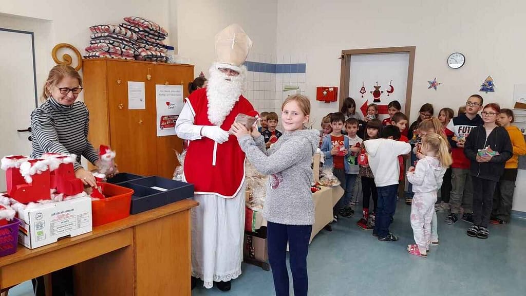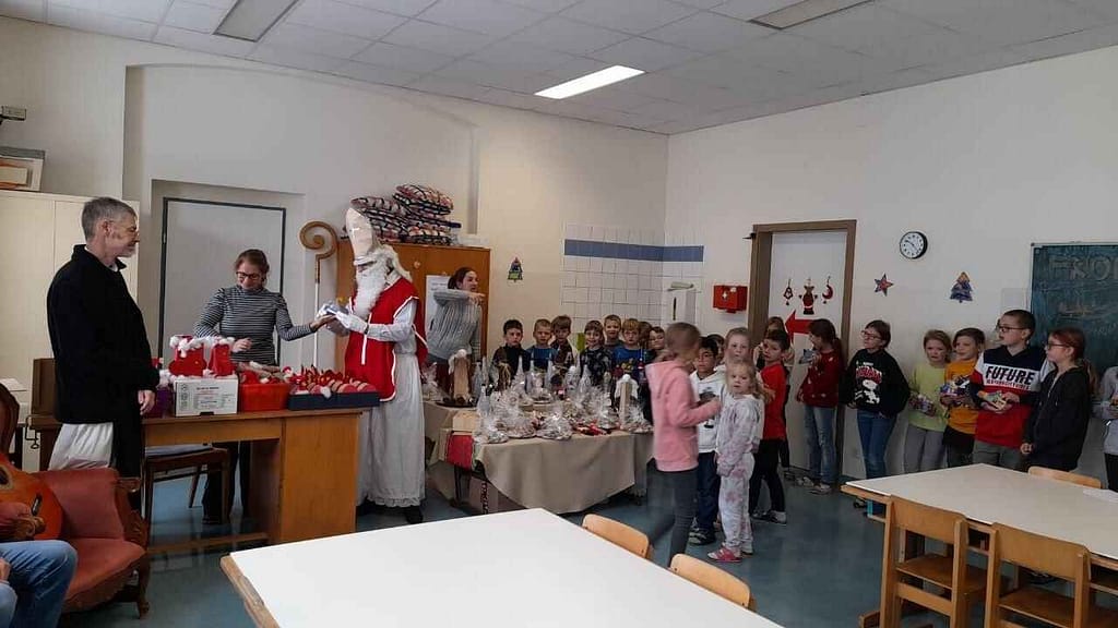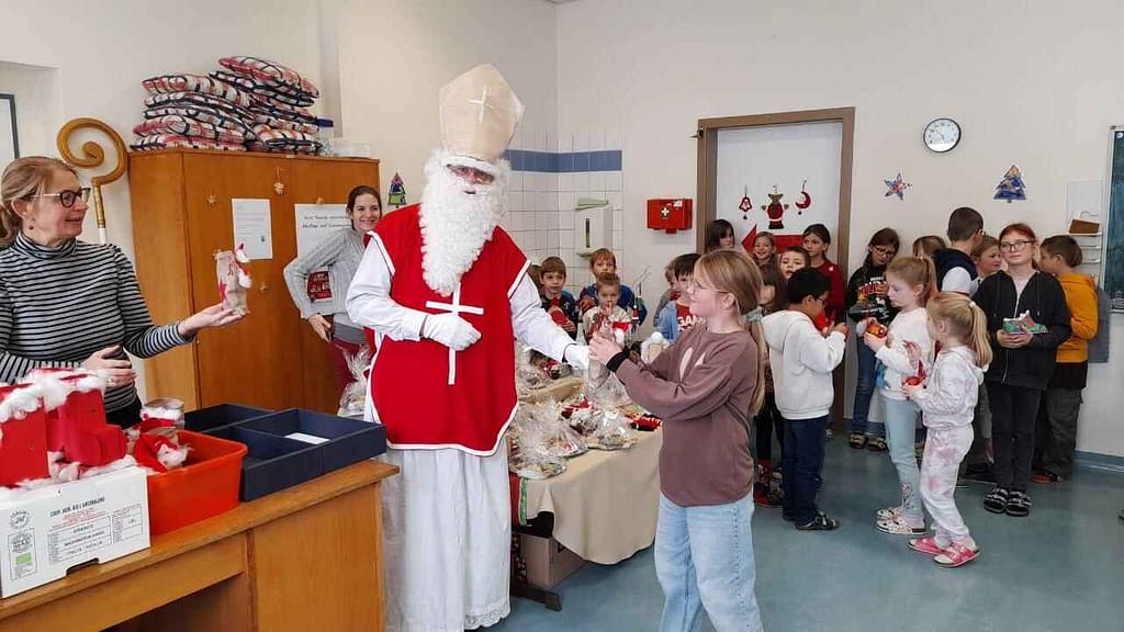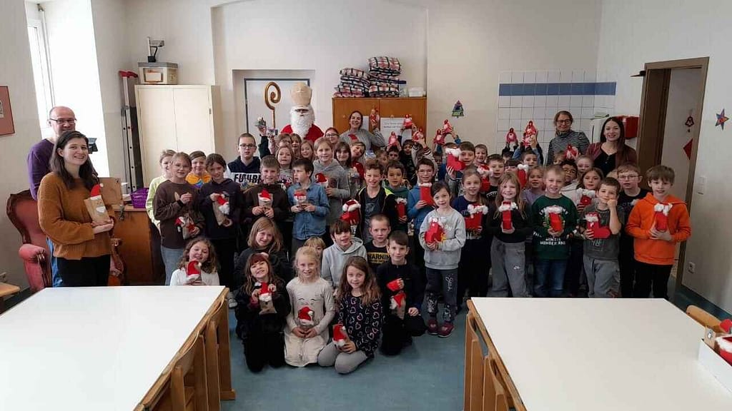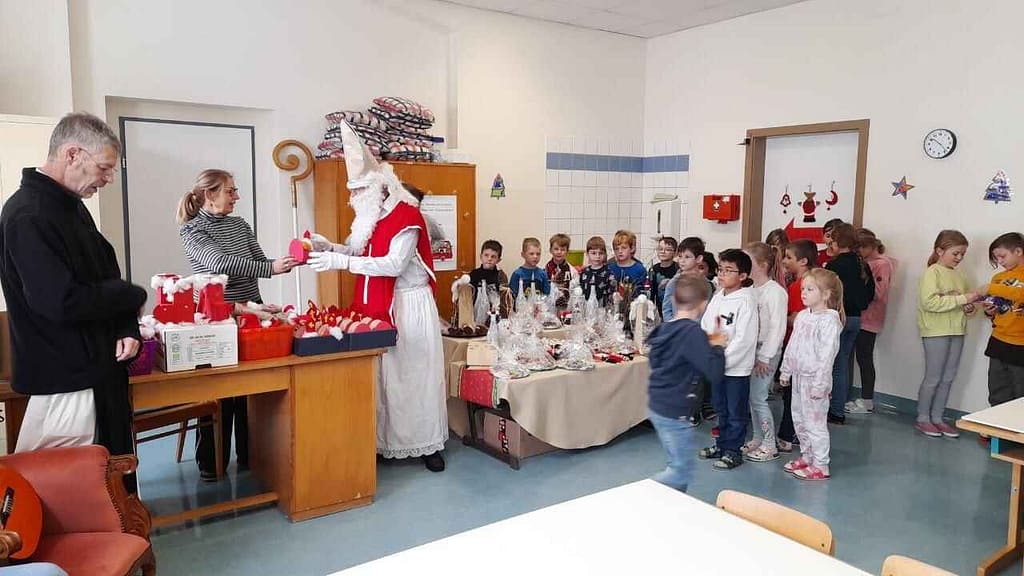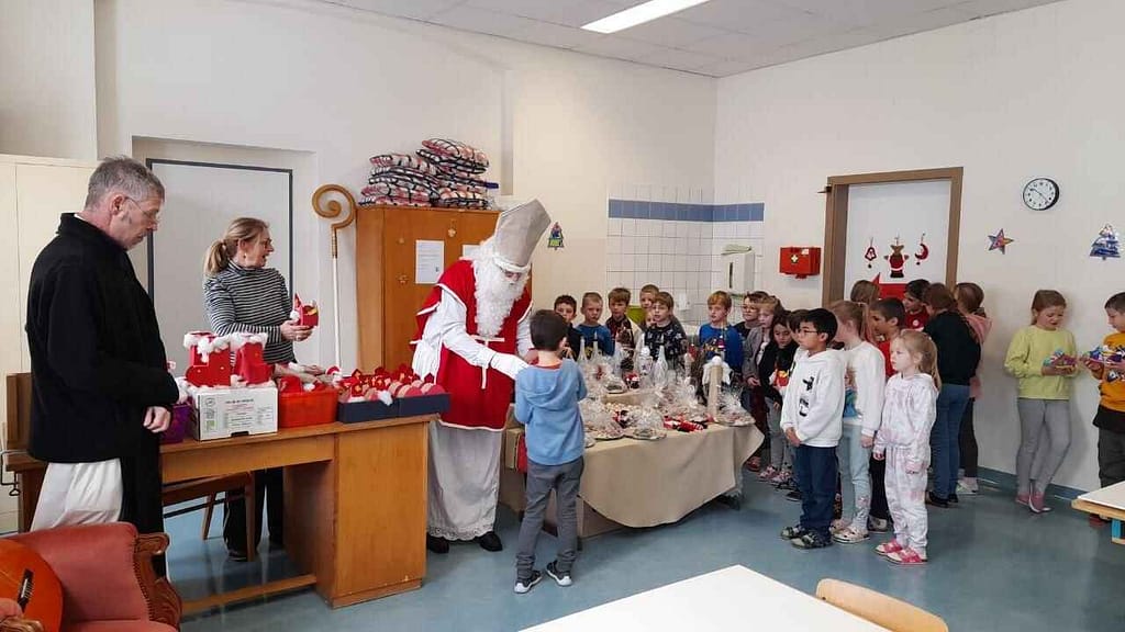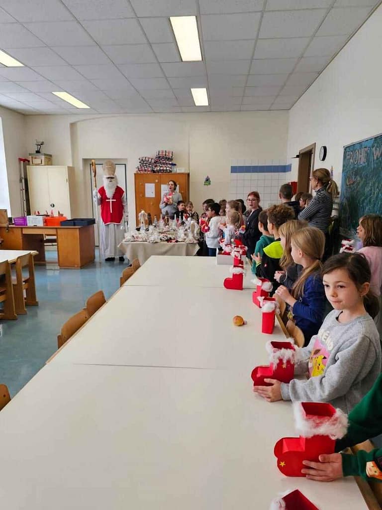 Am 5. Dezember kam uns der Nikolaus besuchen. Die Kinder hatten in den letzten Wochen davor schon fleißig ein Nikolaus-Lied einstudiert, welches sie dem Nikolaus auch gleich vorsangen. Anschließend trugen die Kinder der 1. Klasse ein kurzes Gedicht vor. Daraufhin wurde von Pater Ferdinand ein Segen gesprochen und vom Nikolaus die Stiefel, Schuhe und Säckchen an die Kinder verteilt. Die Kinder freuten sich sehr über den Besuch.