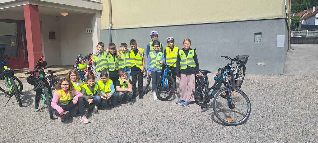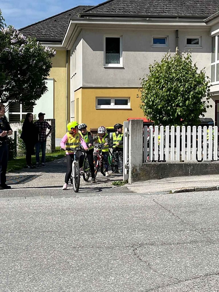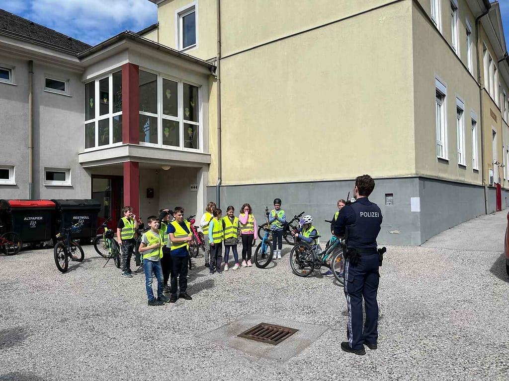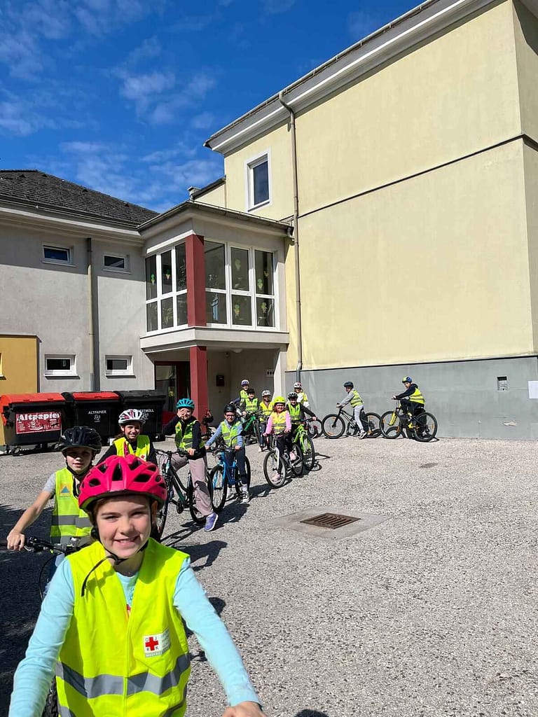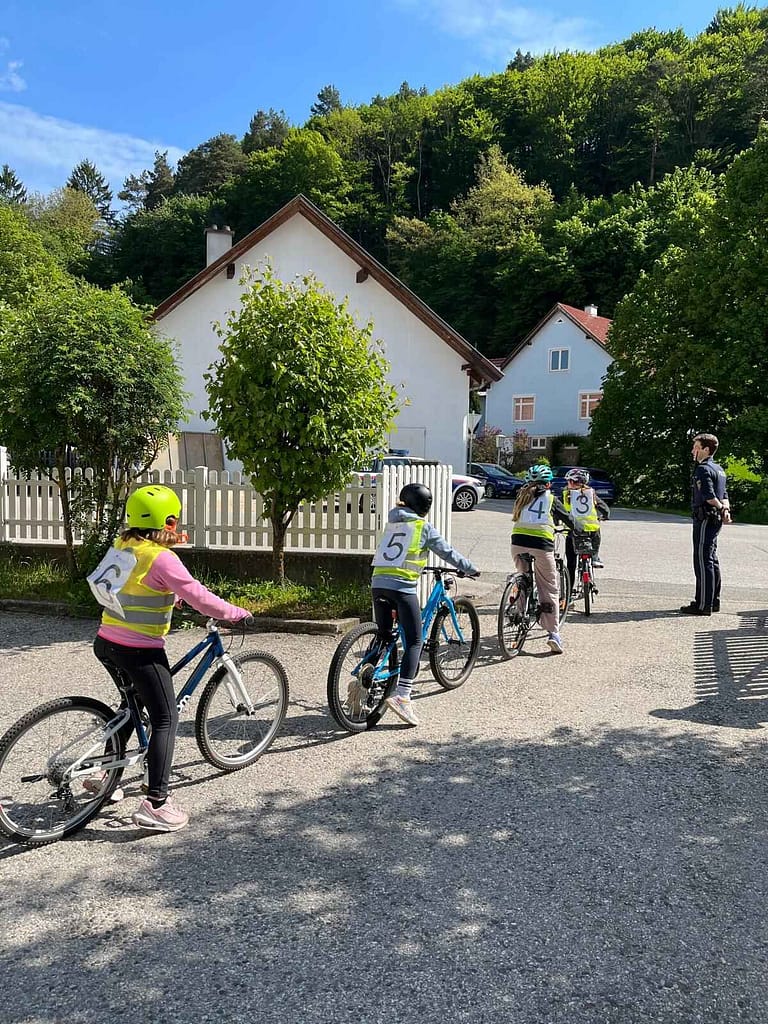Die Schüler und Schülerinnen haben die Fahrradprüfung bestanden!! Zunächst wurde für die theoretische Prüfung gemeinsam gelernt. Heute war die Polizei aus Alland bei uns und hat die praktische Prüfung abgenommen.
