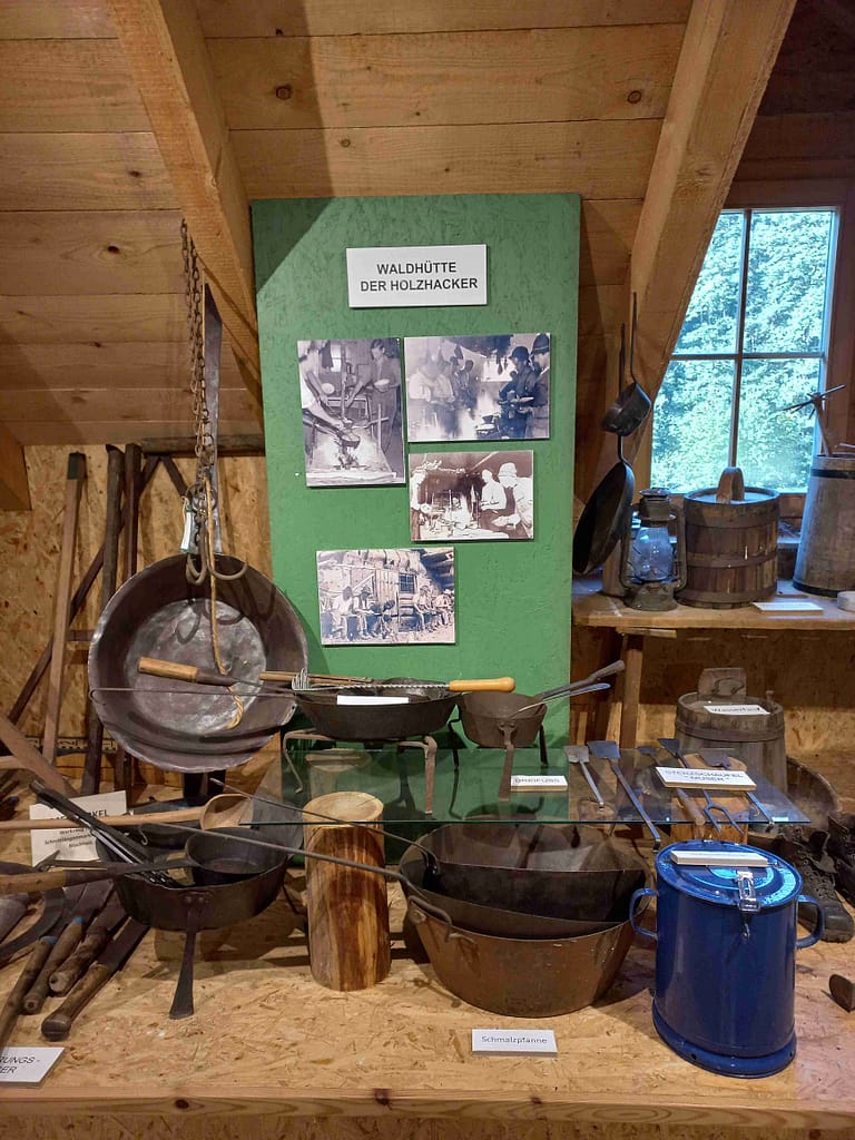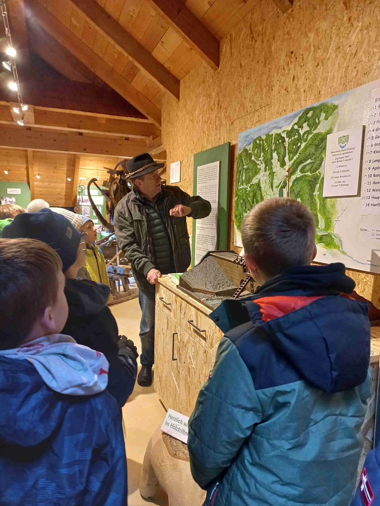 Dort angekommen, wurden wir schon von Othmar Franke und seinem Kollegen Christof Höllige in Empfang genommen. Bei einer Exklusivführung erfuhren wir viel Interessantes über die unterschiedlichen Klausen und die anstrengende und gefährliche Arbeit der Holzfäller. Auch heute hat die Schöpflklause, als Rückhaltebecken bei Hochwassergefahr, eine wichtige Funktion.