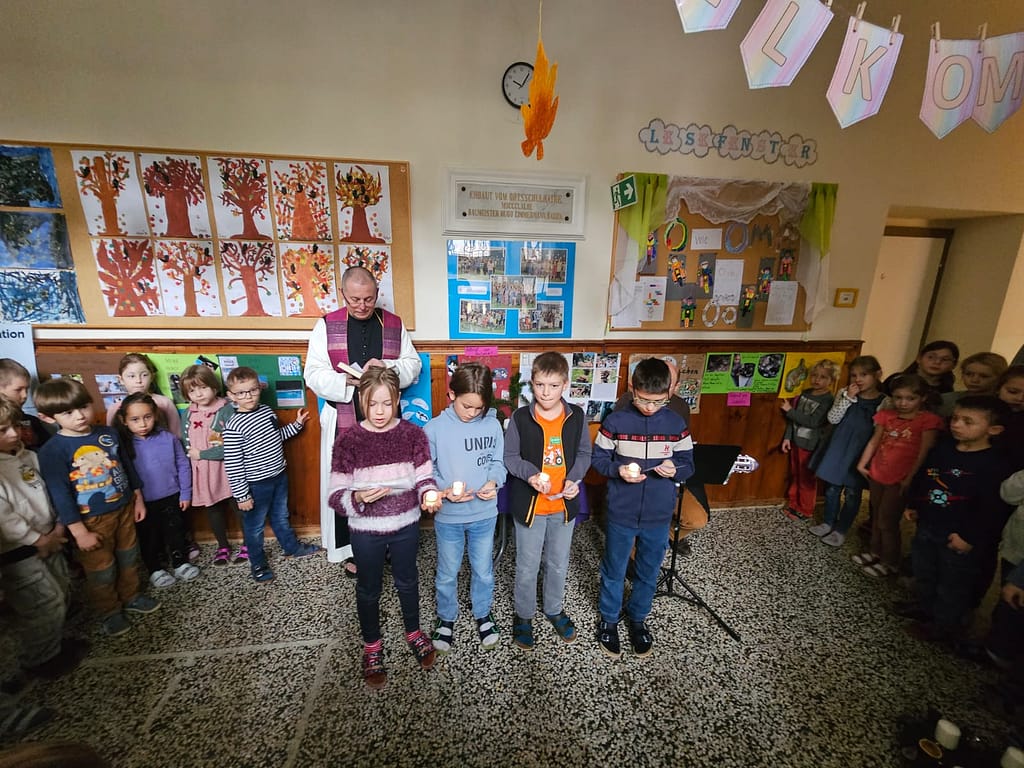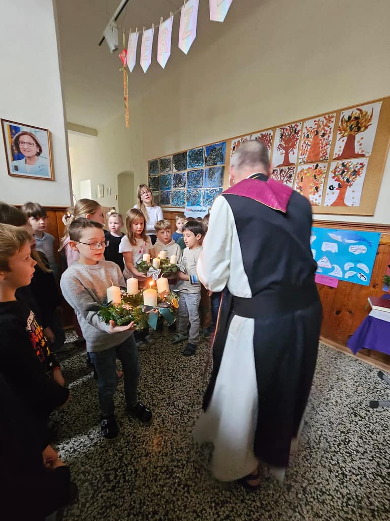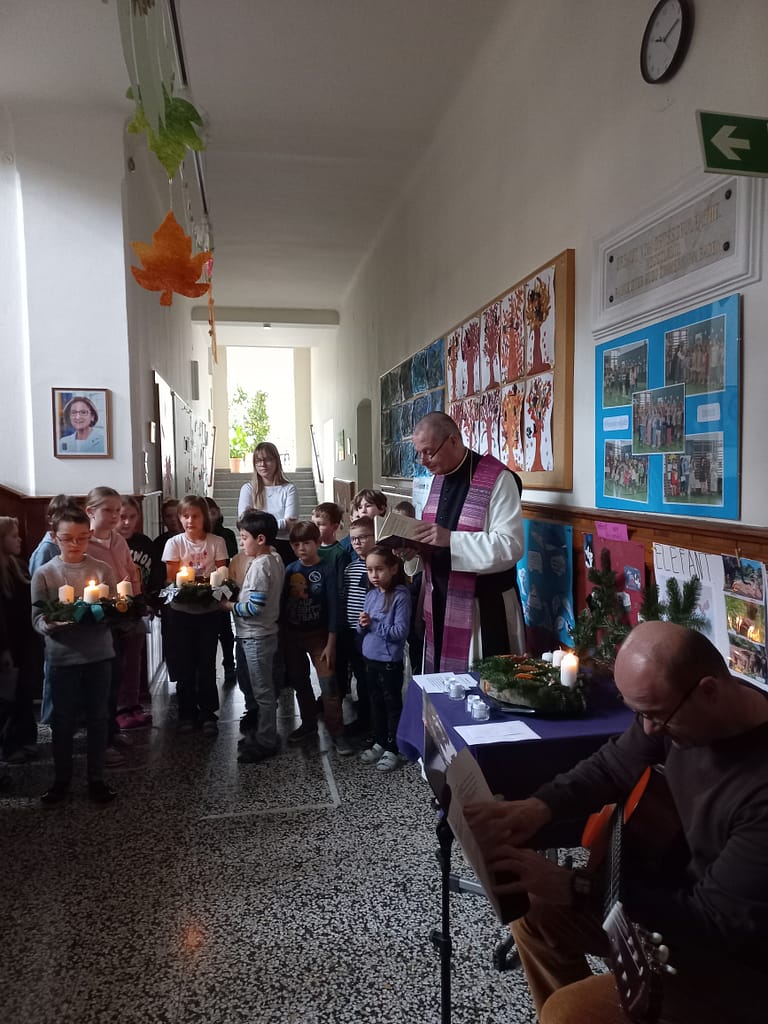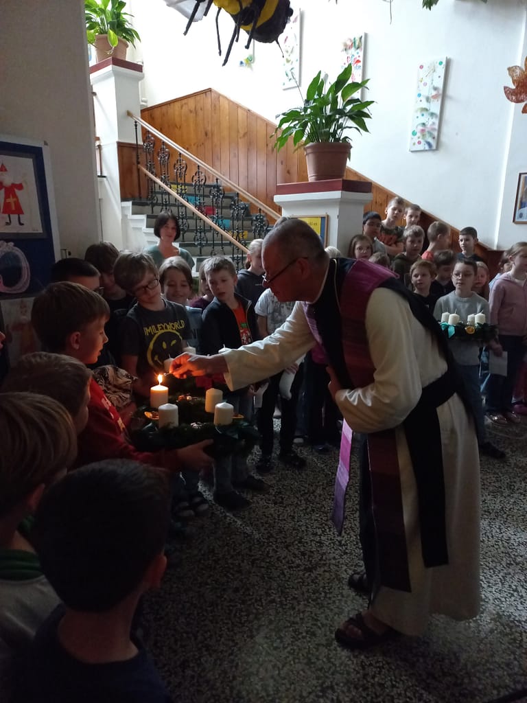 Jede Klasse erhielt vom Elternverein einen liebevoll gestalteten Adventkranz. Um diese in der Schule feierlich zu segnen, besuchte uns Pater Ferdinand. Zu diesem Anlass versammelten sich nach der großen Pause alle Klassen in der Pausenhalle. Gemeinsam wurde gesungen und gebetet. Unser Religionslehrer Herr Ostermayer begleitete die Gesänge auf der Gitarre.