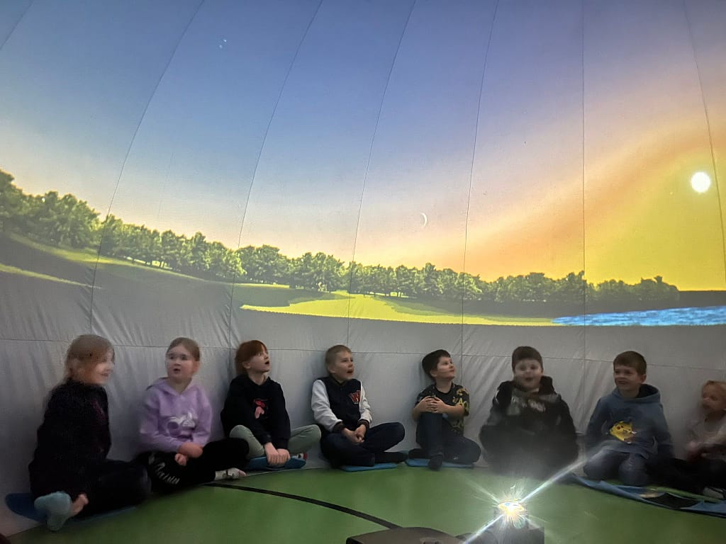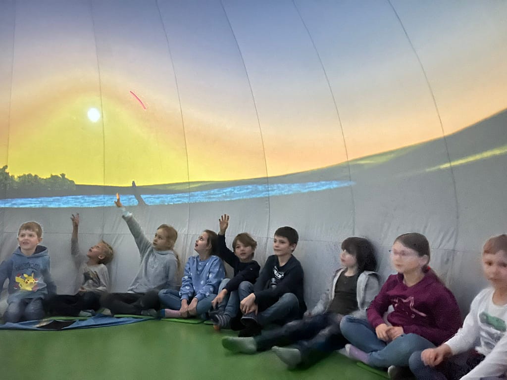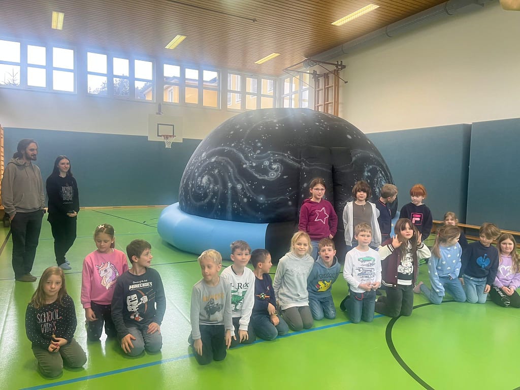 Als besonderes Highlight unseres Planetenprojekts besuchten uns zwei Studierende der Universität Wien mit einem mobilen Planetarium. Im Inneren der aufblasbaren Kuppel zeigte moderne Technik Planeten, Sterne und sogar schwarze Löcher sehr genau. Jede Klasse bekam einen eigenen Vortrag. Dabei konnten die SchülerInnen gezielt Fragen stellen, die ausführlich beantwortet wurden. Das war ein besonders lehrreiches und beeindruckendes Erlebnis.